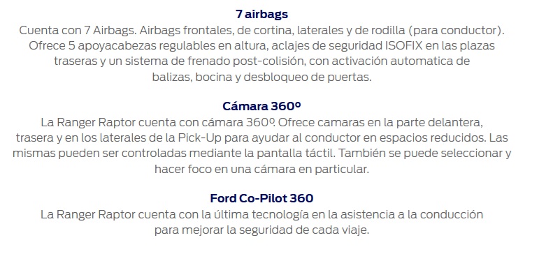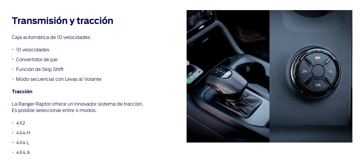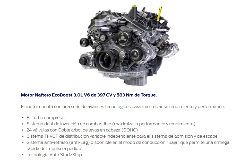 La Ranger Raptor cuenta con un motor naftero Ecoboost 3.0L V6 Bi-Turbo brindando 397 CV de potencia y 583 Newton metros de torque. La motorización más potente diseñada para las Pick-Ups medianas de Ford. Se encuentra disponible con caja automática secuencial inteligente de 10 velocidades.